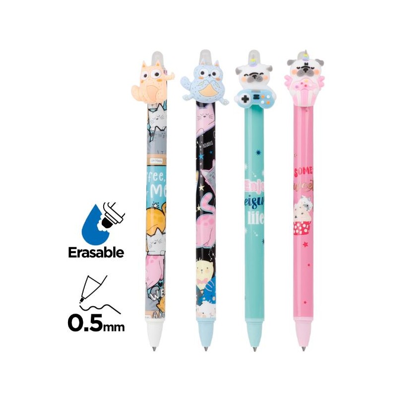 Stylo rétractable effaçable 0,5mm bleu Chat/Chien
