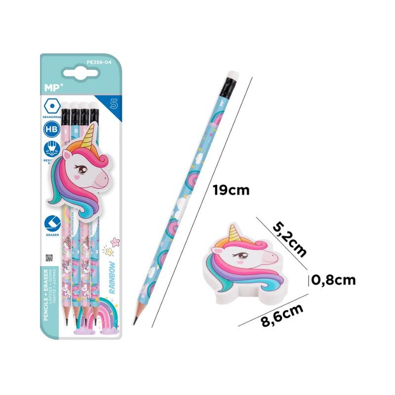 Blister 4 crayons HB décorés + 1 gomme géante Licorne